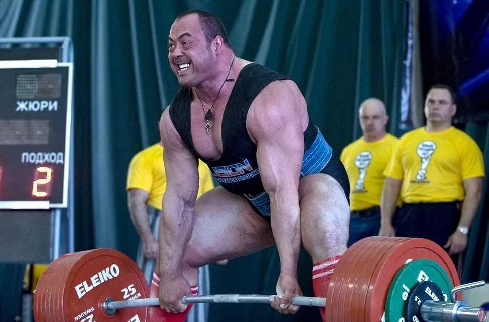 Среда. Пауэрлифтер выполняет упражнения для спины: