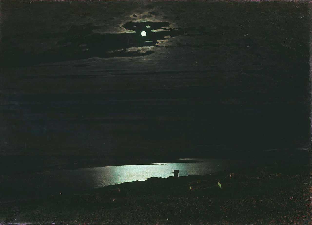 «Лунная ночь на Днепре» (1880) — едва ли не самая прославленная картина Куинджи. Живописец настоял на том, чтобы зрители заходили в темный зал, а картину высвечивало несколько определенно направленных ламп. Такое неординарное решение создавало впечатление светящейся реки.