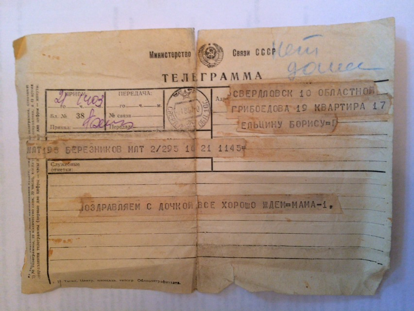 Поздравительная телеграмма Борису Ельцину по случаю рождения дочери Елены. Фото: Архив Президентского центра Б.Н. Ельцина