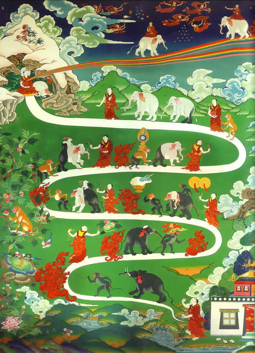 Ум на стезе шаматхи – умиротворение ума. Это своего рода «буддийская инфографика»: танкха изображает последовательные этапы процесса очищения ума (слон).
