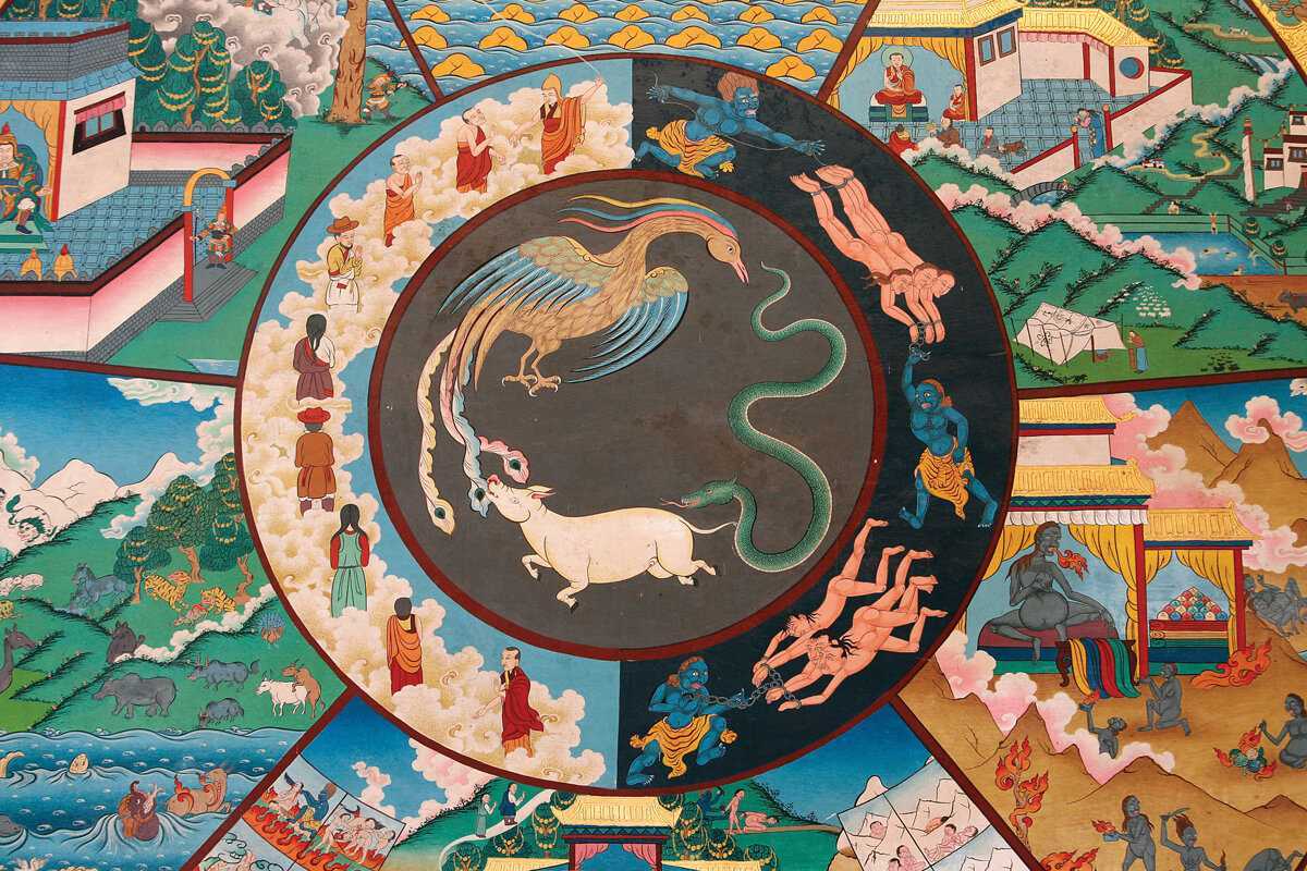 Символически в буддийской иконописи они изображаются как свинья, петух и змея в центре Колеса Сансары.