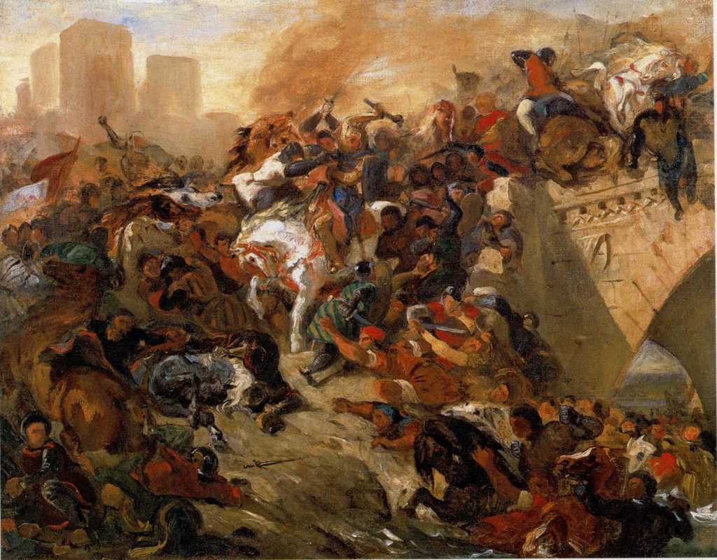 Это эскиз картины, которая была написана в 1837 для нового Исторического музея в Версале. Выставленные в нем полотна должны были прославлять величайшие страницы французской истории. Делакруа посвятил красочное полотно победе короля Людовика IX (1226–1270), окруженного преданными ему воинами, у моста близ Тейебура в 1246.