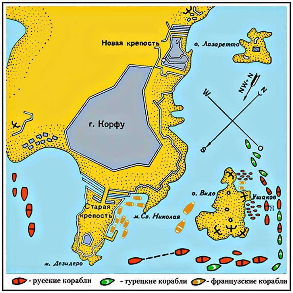 В ходе боевых действий против Корфу, вопреки расхожему мнению, сложившемуся прежде всего благодаря художественному фильму «Корабли штурмуют бастионы», эскадра адмирала Ушакова в действительности бастионы не штурмовала. Корабли вели огонь не по крепости Корфу, а по немногочисленным и практически незащищённым батареям острова Видо. Обстрел Старой крепости с моря был символическим и имел лишь моральный эффект. Подставлять корабли под многочисленную береговую артиллерию мощнейшей цитадели со стороны Ушакова было бы просто безумием.