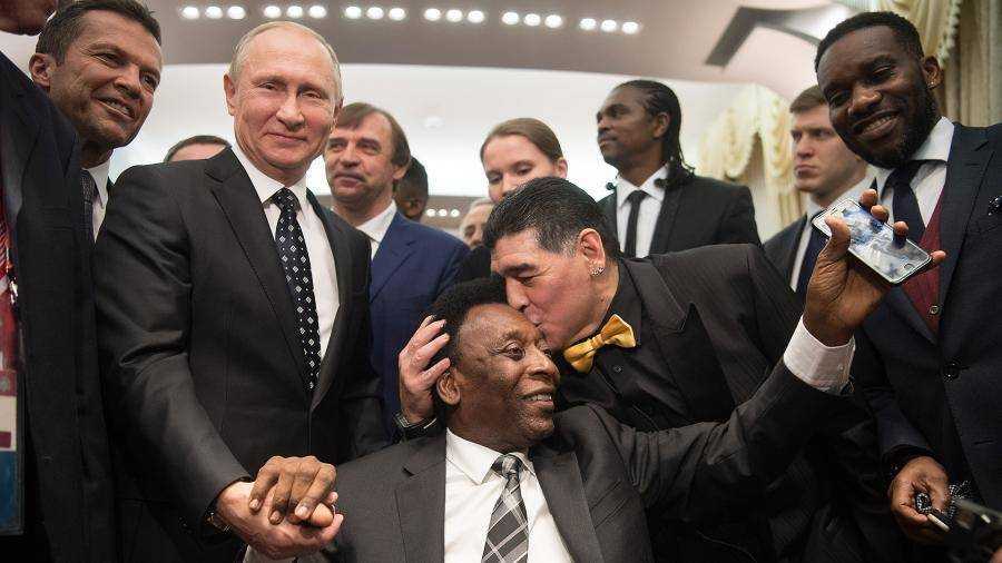 Президент РФ Владимир Путин, бразильский футболист Пеле и аргентинский футболист Диего Марадона во время встречи со звездами мирового футбола, приехавшими в Москву для участия в финальной жеребьевке чемпионата мира по футболу ФИФА-2018 в России, 1 декабря 2017 года