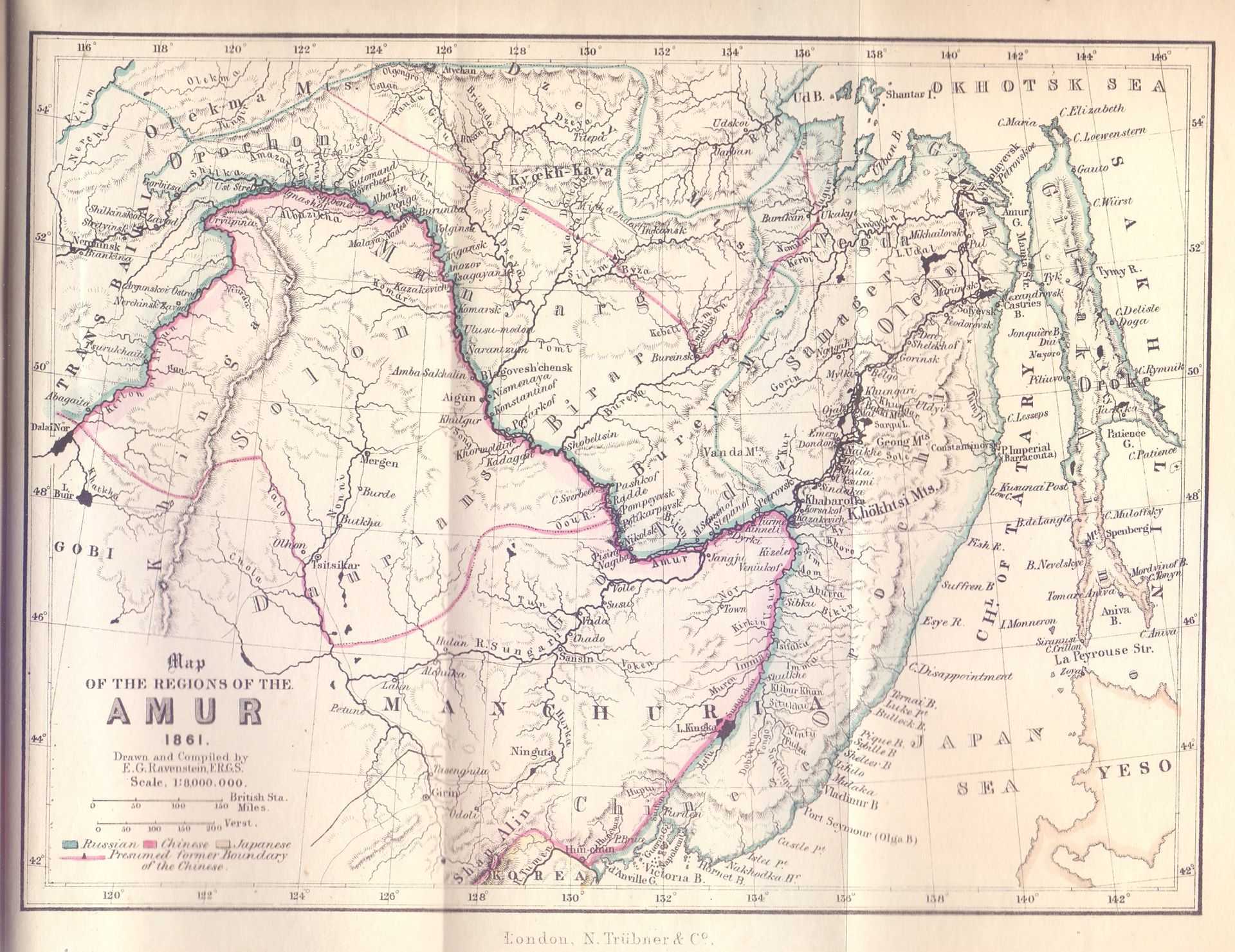 Отпечатанная в Лондоне карта Дальнего Востока с английскими и французскими топонимами. 1861 год