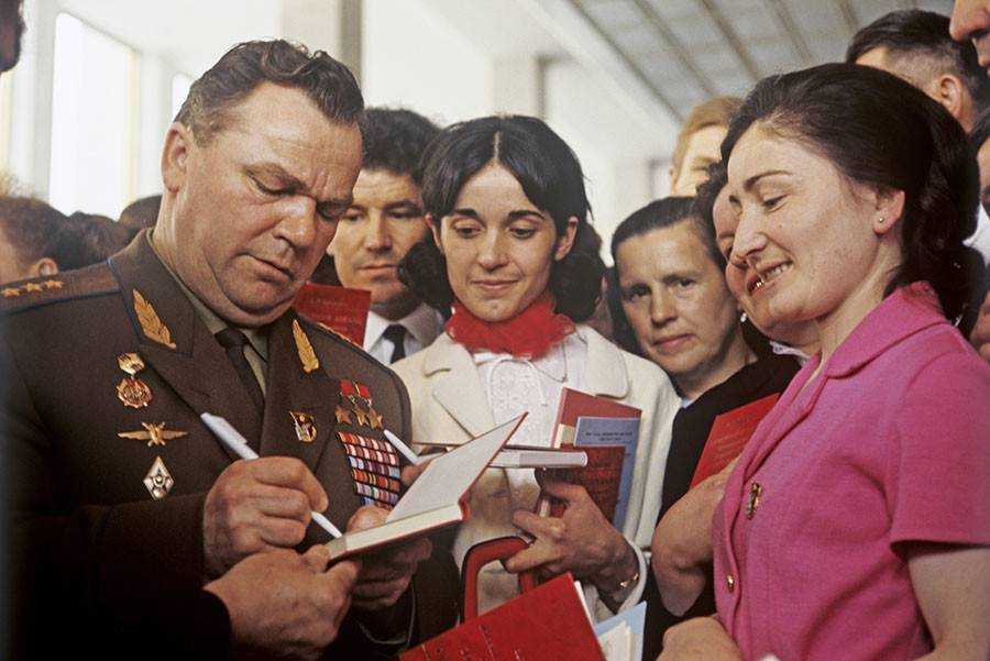 - Советский лётчик, генерал-полковник авиации, трижды Герой Советского Союза Иван Никитович Кожедуб во время раздачи автографов в Кремлёвском дворце съездов