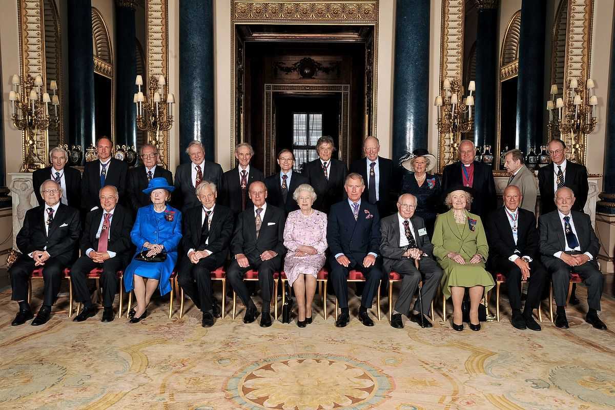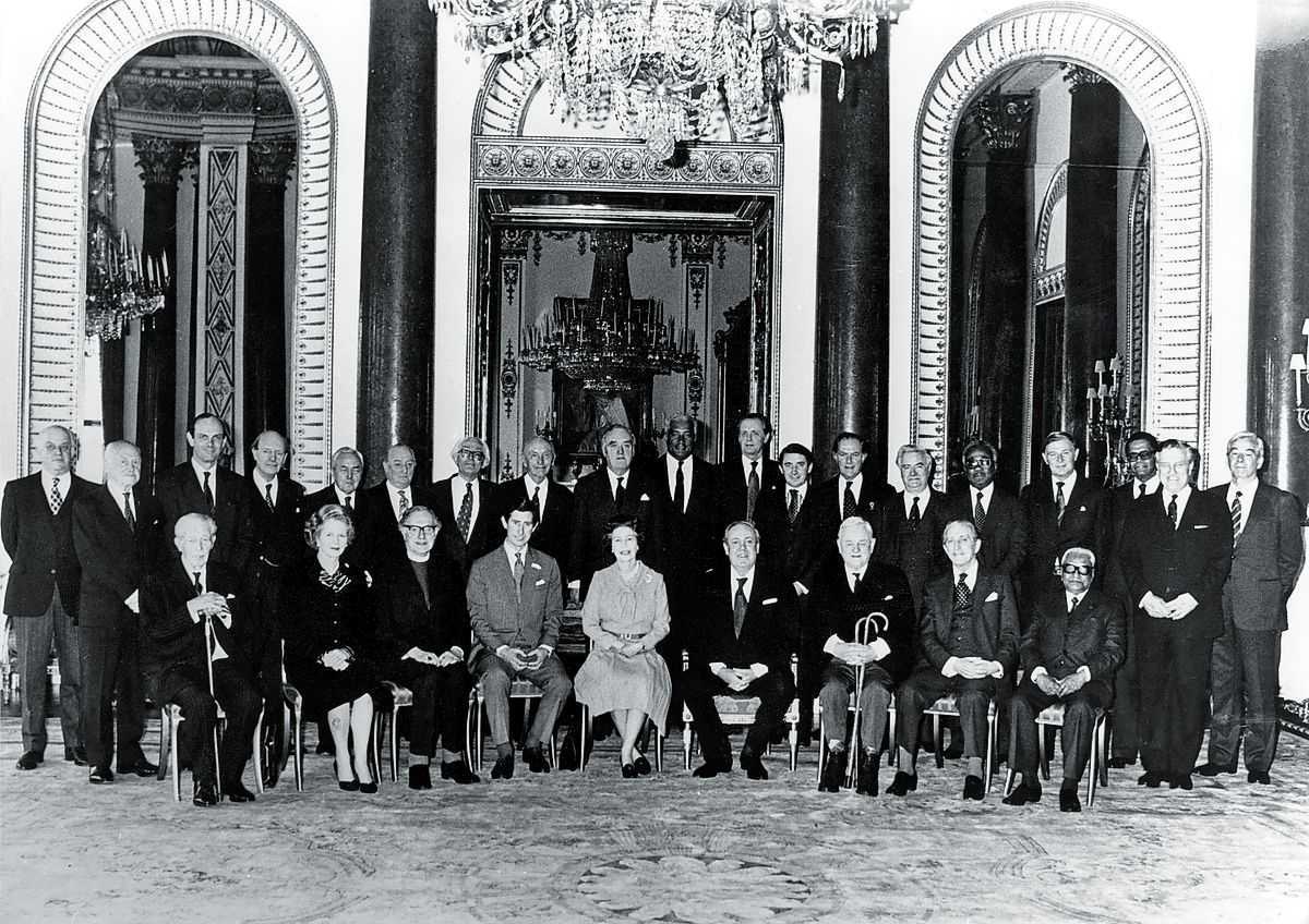 Принц Чарльз и Королева Елизавета II вместе с членами совета, среди которых Премьер-министр Великобритании Маргарет Тэтчер в Лондоне, 27 марта 1981 г. Королева Елизавета II с кавалерами ордена «За заслуги», включая Маргарет Тэтчер (в синем костюме), 2009 г.