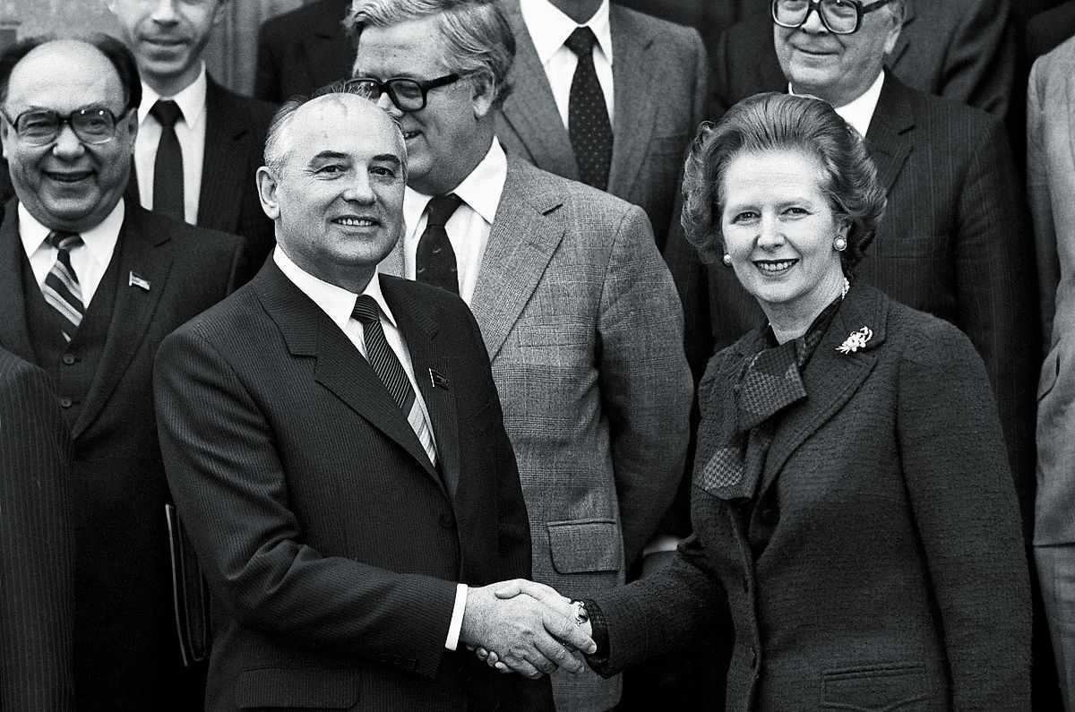 Михаил Горбачев пожимает руку премьер-министру Маргарет Тэтчер в Лондоне, 16 декабря 1984 г. Пожимает руку президенту Египта Хосни Мубараку у ее дома в Чекерсе, 3 февраля 1982 г.