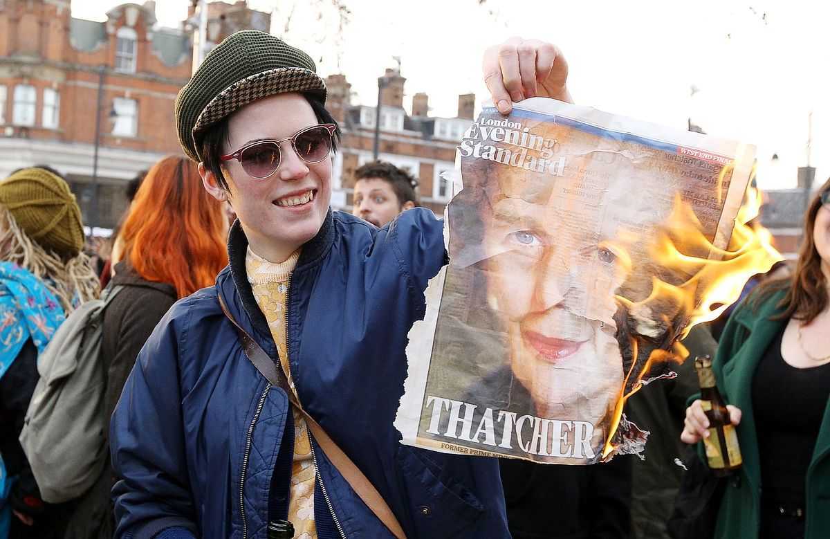 Женщина сжигает первую полосу газеты с изображением бывшего премьер-министра Великобритании Маргарет Тэтчер в Лондоне, 8 апреля 2013 г.