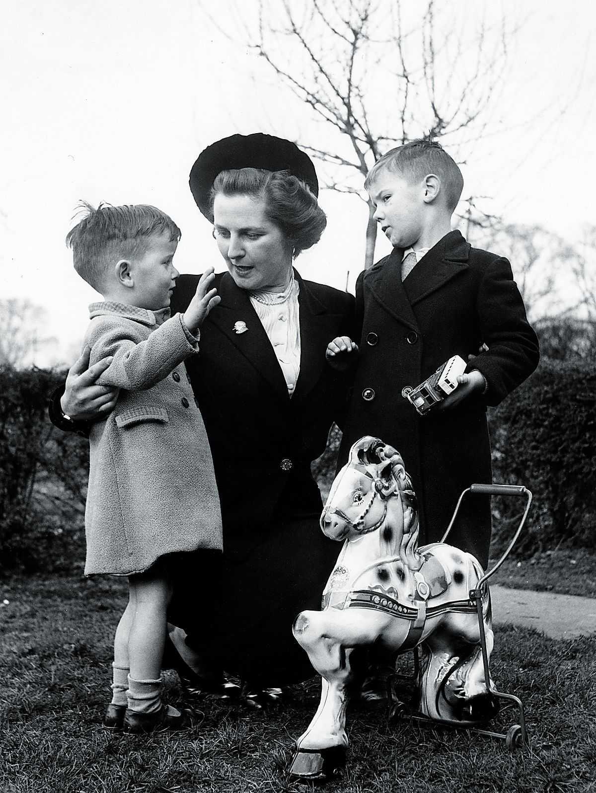 На вечеринке в саду в Букингемском дворце в качестве члена парламента от консерваторов, 1950 г. Разговаривает с мальчиками Рики и Джейми Миллерами во время агитации в своем избирательном округе Дартфорд, Кент, 1950 г.