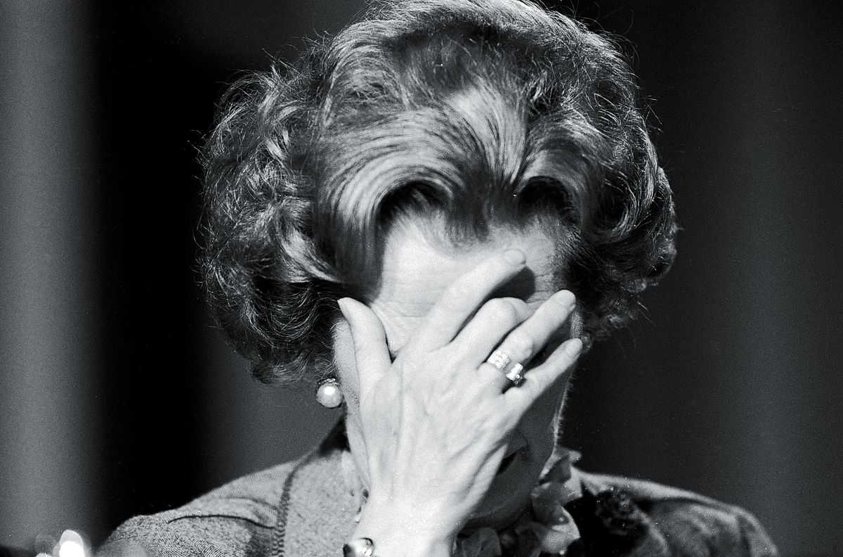 Закрыла лицо рукой на конференции Консервативной партии, 1985 г.