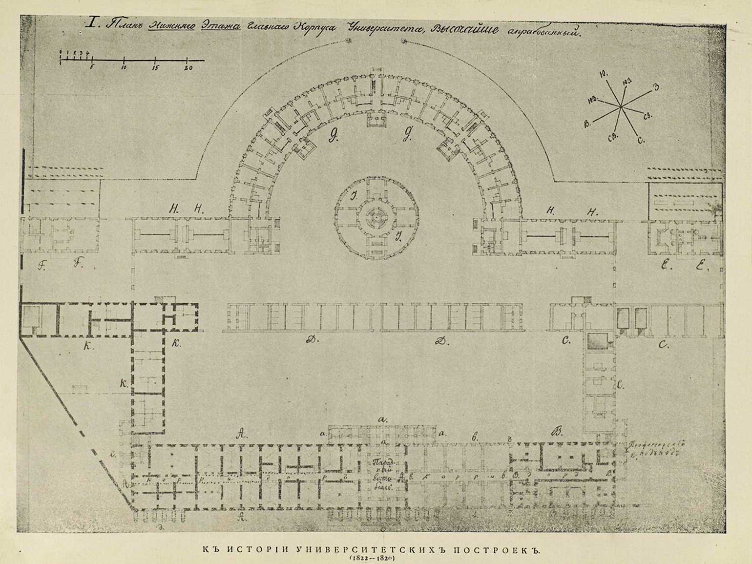 План первого этажа Казанского университета. Изображение: Загоскин Н. П. История Императорского Казанского университета за первые сто лет его существования, 1804–1904. ― Типо-литография Императорского Казанского университета / Российская государственная библиотека