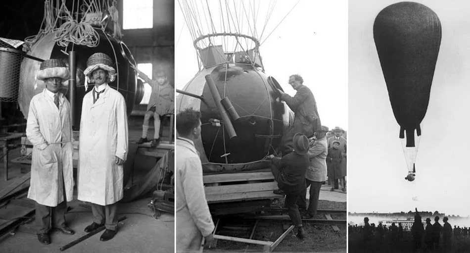 Огюст Пиккар и его спутник Пауль Кипфер в плетеных шлемах, сделанных перед вылетом.