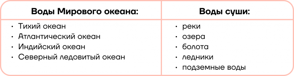 Всё, что не входит в вышеперечисленное, называют материковыми водами (воды суши). Эти объекты не связаны с океаном, то есть являются внутренними. Например, Каспийское море (озеро), реки Сырдарья и Амударья.