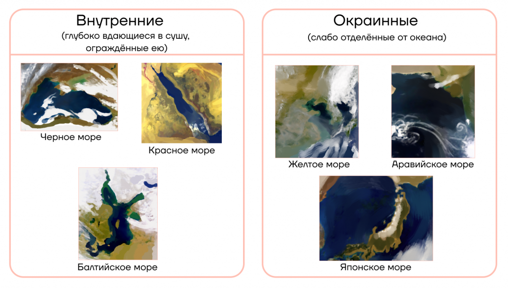 Морем называют обособленную сушей или подводными поднятиями часть океана, имеющую свой гидрологический режим (оттаивание/замерзание, изменение температуры воды и т.д.). Различают два вида по их расположению. На дне морей будто бы существует свой мир. Со своими горами, гейзерами и реками. Да-да, река на дне моря — реальность, обусловленная тем, что плотность воды в них различается.