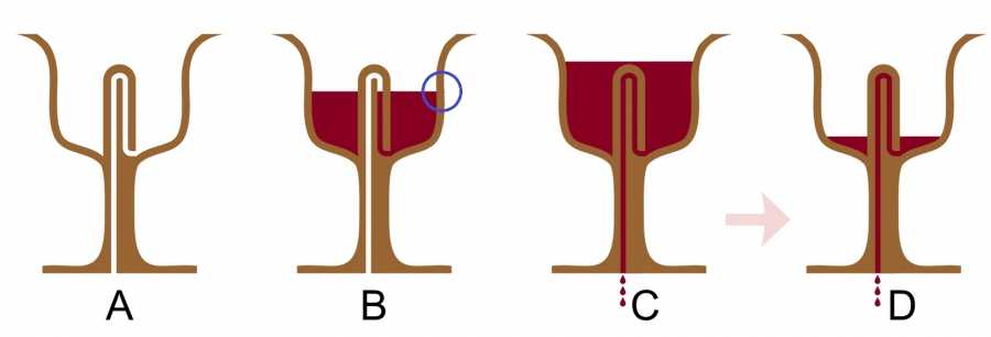 Согласно легенде, Пифагор, дабы ограничить употребление вина, сделал кружку, которую можно было наполнить хмельным напитком только до определенной метки. Стоило превысить норму хоть на каплю, и все содержимое кружки вытекало наружу. В основе этого изобретения лежит действие закона о сообщающихся сосудах. Изогнутый канал в центре кружки не позволяет ее наполнять до краев, «избавляя» емкость от всего содержимого в случае, когда уровень жидкости находится выше изгиба канала.