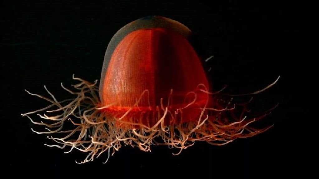 Медузы традиционно обитают в верхних водных слоях. Но бентокодон комфортно себя чувствует на глубине порядка 750 метров. Внешне удивительный житель Марианской впадины напоминает красную летающую тарелку D 2-3 см. Края «тарелки» обрамляют 1,5 тыс. тончайших щупальцев, которые помогают медузе ориентироваться в пространстве и быстро передвигаться, преодолевая толщи воды.