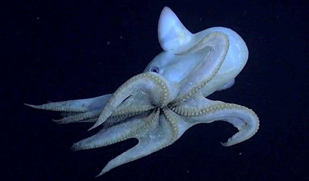 Симпатичное животное, обитающее на глубине в 7 тыс. метров, является самым глубоководным осьминогом среди известных науке. За счет широкой колоколообразной головы и размашистых слоновых «ушек» его часто называют не иначе, как осьминог Думбо.