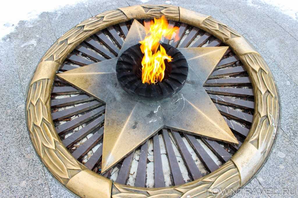 В бронзовой чаше горит Вечный огонь, на гранитной стене выбиты имена ульяновцев, удостоенных звания героя Советского Союза. К монументу ведет просторная лестница.