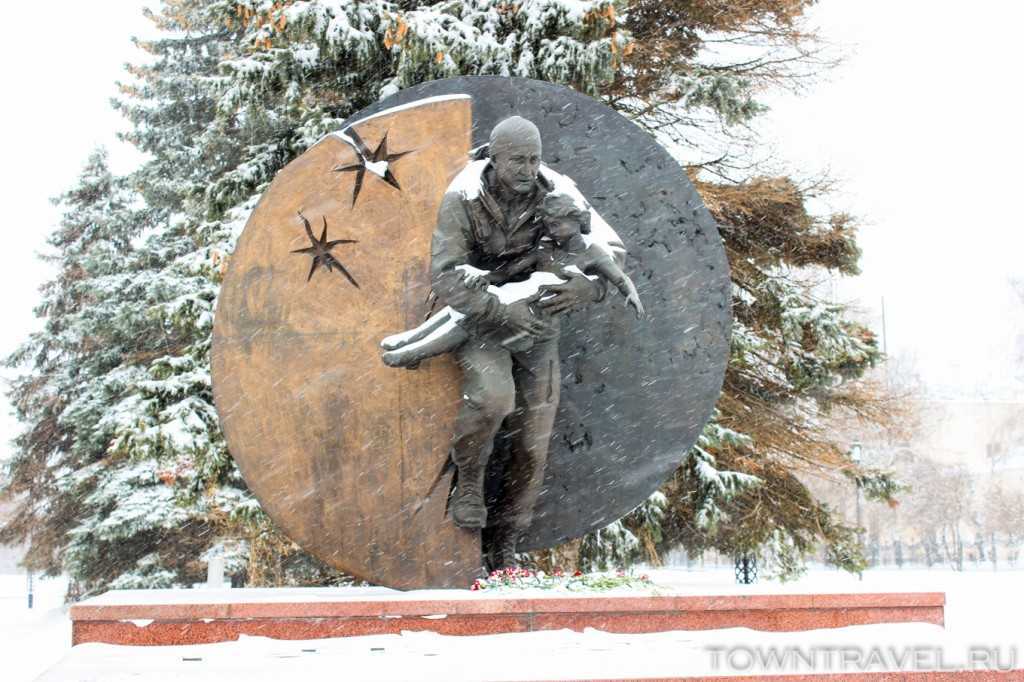 47-метровая стела увенчана звездой, у подножия монумента расположена скульптурная группа идущих в атаку бойцов, на гранитной стене выбиты имена героев, рядом не угасает Вечный огонь.