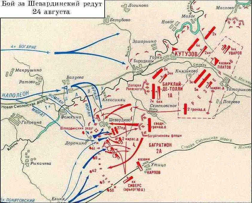 24 августа 1812 года за 2 дня до решающей битвы, состоялась битва за шевардинский редут. Этим редутом командовал генерал Горчаков, в подчинении которого находилось 11 тысяч человек. Южнее, с корпусом в 6 тысяч человек, располагался генерал Карпов, который прикрывал старую Смоленскую дорогу. Наполеон начальной целью своего удара наметил шевардинский редут , поскольку он был максимально отдален от основной группировки русских войск. По замыслу французского императора Шевардино следовало окружить, тем самым выведя армию генерала Горчакова из сражения. Для этого французская армия в атаке составила три колонны: