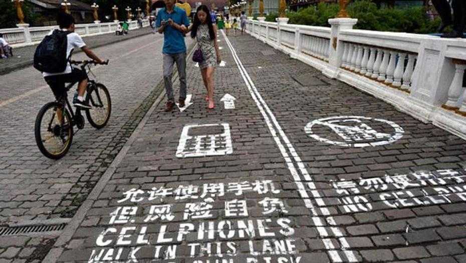 30. В китайских городах Чунцин и Сиань построены специальные пешеходные дорожки для людей со смартфонами. Эти участки дороги напоминают велодорожки и выделены двойной сплошной линией, имеют по одной полосе для движения в противоположных направлениях и обозначения, нанесенные на тротуар.