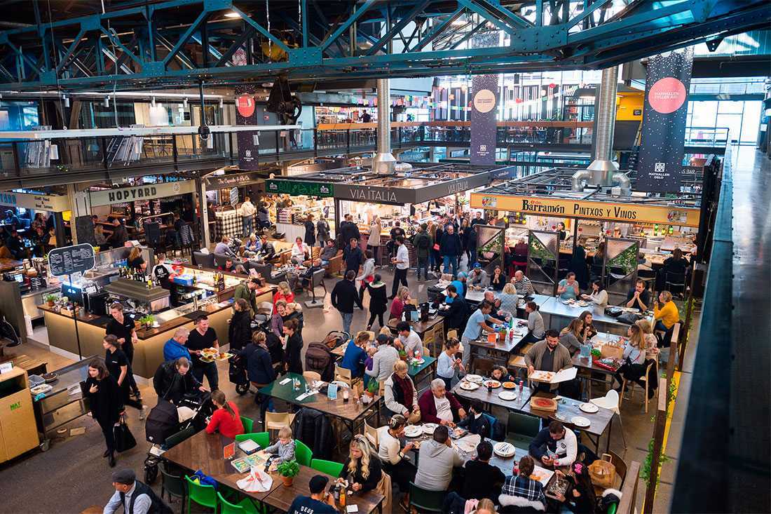 На обед вам предложат здесь ультра-интернациональный выбор блюд, в том числе баскские пинчос, пиццу ручной работы и уличную еду со всего мира.