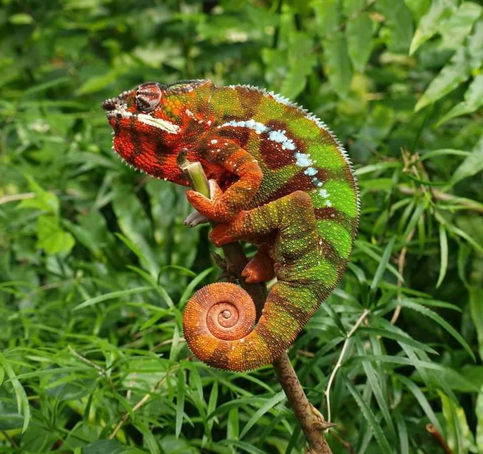 Обитающий на острове Мадагаскар гигантский хамелеон примечателен тем, что этой самый большой хамелеон в мире. Длани его тела достигает 68 см. Имеет коричневое туловище, усыпанное желтыми, зелеными и красными пятнами.