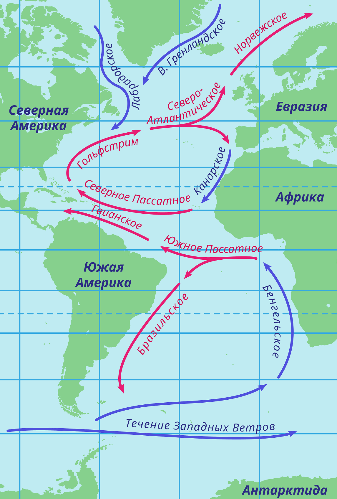 Поскольку Атлантический океан вытянут по вертикали, его основные течения также направлены с севера на юг и обратно.