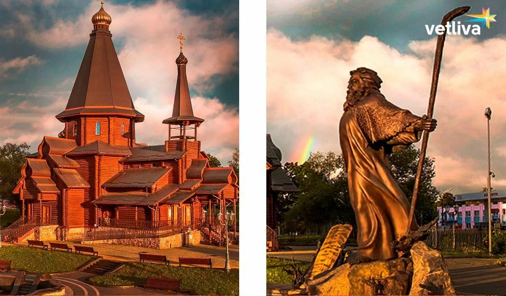 Необычный храм немного напоминает изящный домик, сложенный из спичек, не правда ли? Несмотря на свою молодость (возведен всего в 2001 году), он построен с соблюдением традиционных технологий. В строительстве принимало участие всего 6 человек, а их основным орудием был топор. Кстати, этому есть и логическое объяснение: считалось, что спиленное дерево больше подвержено гниению, чем срубленное. Внутри церкви расположен уникальный пятиярусный иконостас, где каждый уровень посвящен отдельному сюжету.