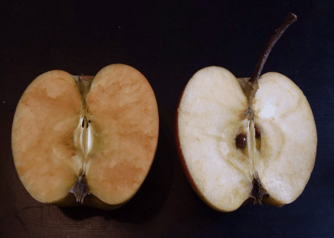 Когда яблоко разрезается или надкусывается, возникает реакция яблока с кислородом. Когда кислород присутствует в клетке, полифенольная оксидаза в хлоропластах быстро окисляет фенольные соединения, присутствующие в тканях яблок, в хиноны. Хиноны производят коричневый цвет за счет реакции, которая создает соединения с аминокислотами или белками.