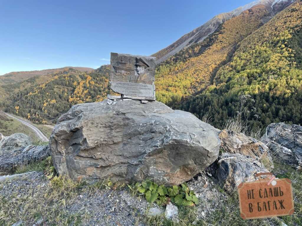 если ехать от Транскама, то нужно с левой стороны искать такой памятник на камне. И прямо от него повернуть налево на не асфальтированную дорогу. Дальше 100 метров и Вы непременно увидите трубы, из которых набирают воду. Кстати, много воды можно не набирать, считается, что она утрачивает полезные свойства через 30 минут.
