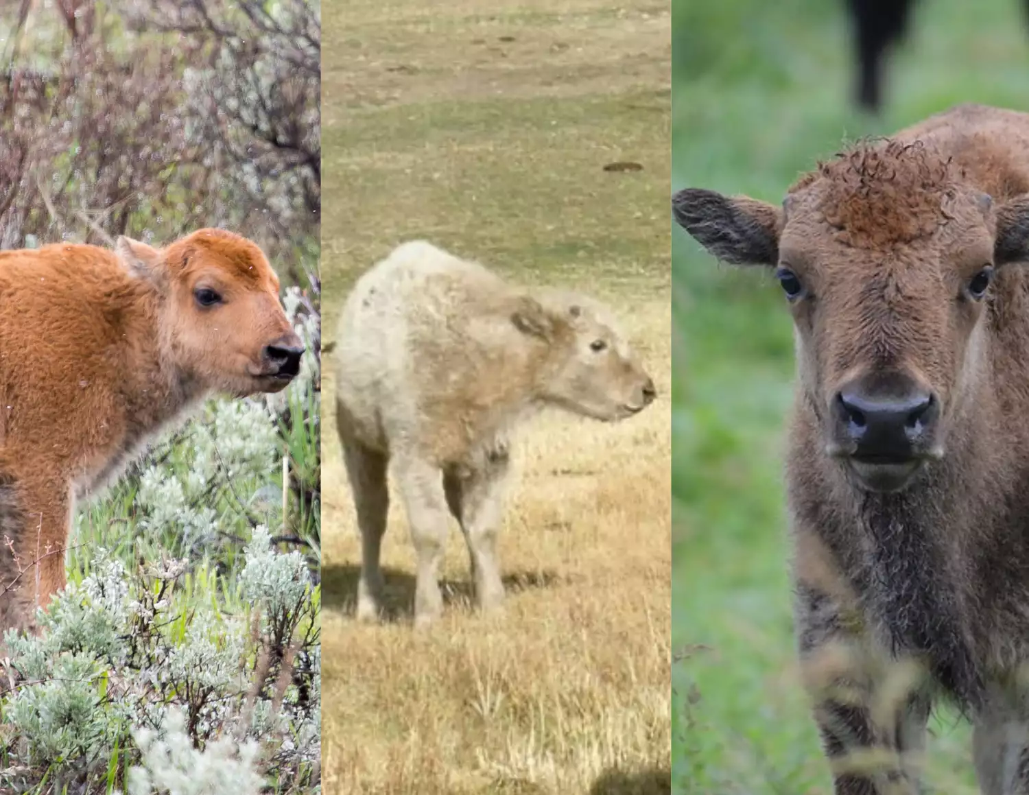 Телята чистого бизона обычно имеют рыжий цвет при рождении, а по мере роста их шерсть темнеет. Этот процесс начинается после двух месяцев и завершается к четырехмесячному возрасту. Белые телята – это альбиносы, лейцисты или истинно белые бизоны. У альбиносов отсутствует весь пигмент, и они имеют розовые глаза, у лейцистов – голубые глаза, а белые бизоны просто рождаются с генетически белой шерстью. Настоящие белые телята склонны к изменению цвета, как и типичные рыжие телята. Белые телята считаются священными у многих коренных народов Северной Америки. (, )