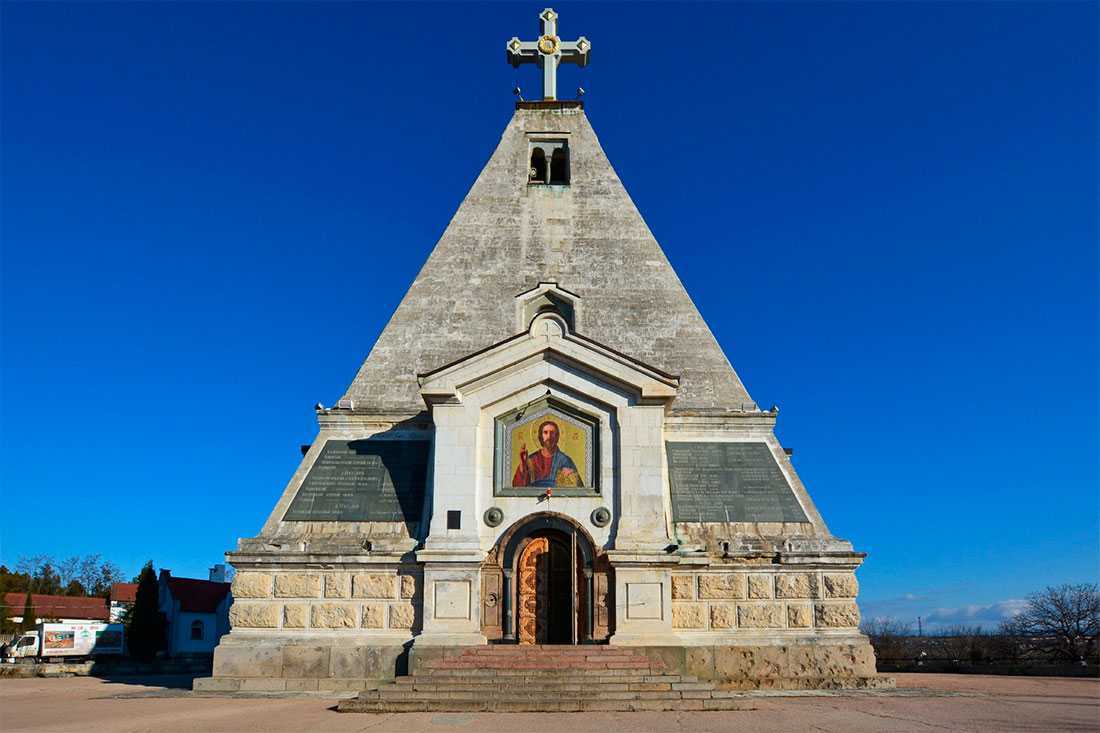 Храм уникален необычной для отечественной архитектуры пирамидальной формой и посвящен героической обороне города в годы Крымской войны.