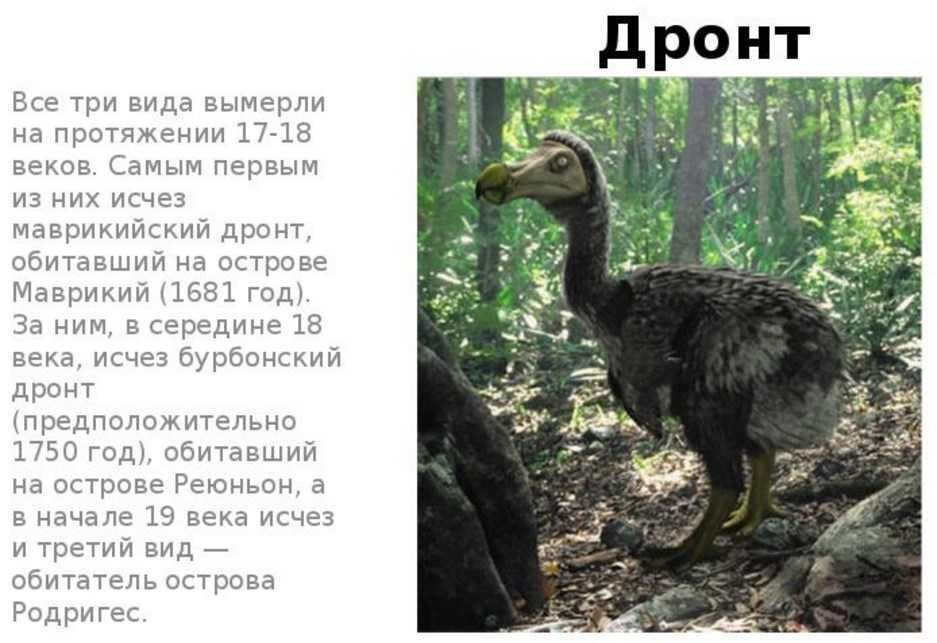 На островах обитала птица, которая считалась большим голубем — дронт (другое название — птица додо), маврикийский вид которого был полностью уничтожен к середине XVII веку.