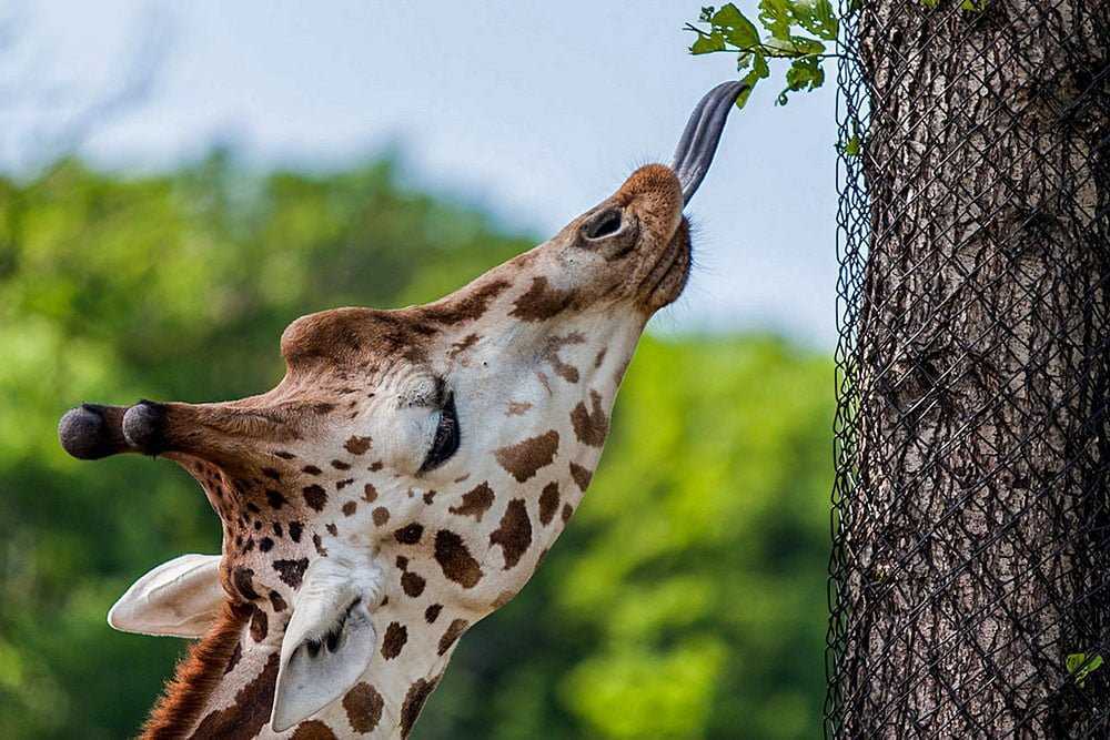 Жирафы используют свои языки, чтобы дотягиваться между ветками до самых сочных листьев и почек, висящих высоко наверху. Язык жирафа — чудо природы. Как рука, язык жирафа может перебирать листья внутри кроны дерева и вокруг ветвей, затем плотно схватить пучок и втянуть их в рот жирафа. Язык жирафа также очень жесткий, что позволяет ему безопасно срывать листья с растений с шипами.