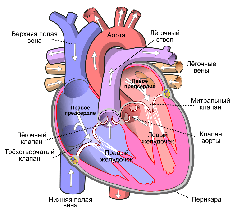 Сердце — крупный мышечный орган, который расположен в грудной полости. Оно весит примерно 300 г, при этом перекачивает по всему организму более 7000 л крови в сутки и делает это всю жизнь человека. Расслабляясь, сердце вбирает в себя кровь, а сжимаясь, выталкивает. То, что мы воспринимаем как его биение, и есть эти сокращения и расслабления. Сердце состоит из четырех камер: двух предсердий (сверху) и двух желудочков (снизу). Предсердие выталкивает кровь через клапан в желудочек, который направляет ее в аорту.