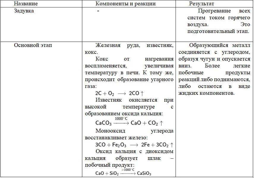 - Доменный процесс — распространенный метод. Железная руда и флюс восстанавливаются углеродом кокса, в результате получаем чугун. При надобности из чугуна удаляют примеси (фосфор, сера) и избытки углерода в мартеновских печах или в конвертерах. Легированную сталь получают в электрических печах (ЭПС).