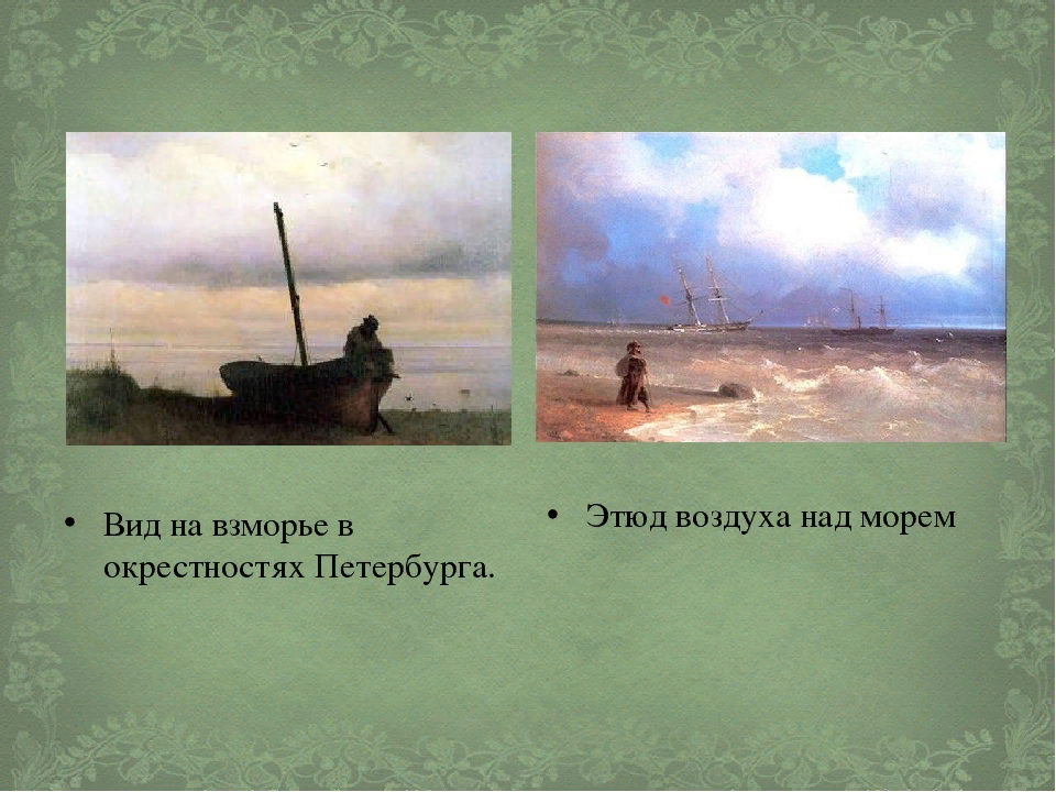 Две его ранние юношеские работы — «Этюд воздуха над морем» и «Вид на взморье», написанные в 1835 году, восхитили баснописца Крылова: