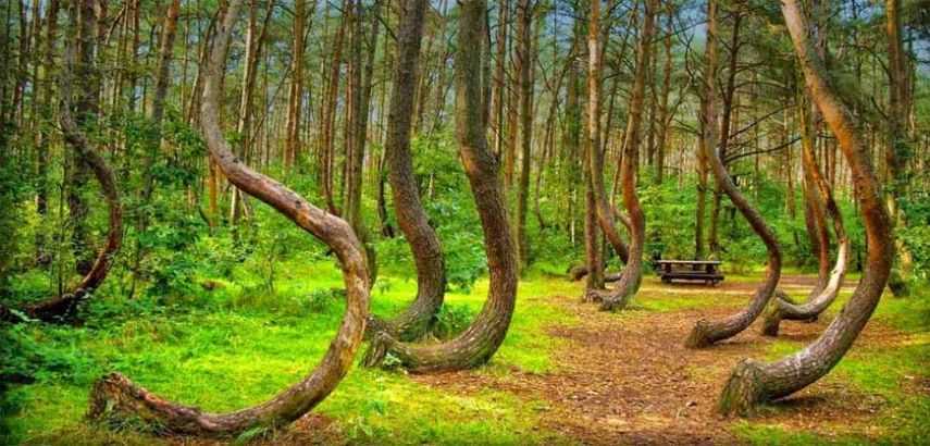 Кривой лес находится недалеко от города Грыфино в Польше. Его название довольно «говорящее», ведь в этом лесу, действительно, растут кривые деревья. И, наверное, это было бы не сильно удивительно, если бы их кривизна не была столь идеальна. Каждое из 400 деревьев в Кривом лесу первые 20 см растет прямо, а потом искривляется почти под углом 90 градусов, затем ровной дугой дерево вновь начинает расти вверх. Удивляет не только такая похожая форма изгиба, но и то, что все деревья изгибаются в северную сторону.