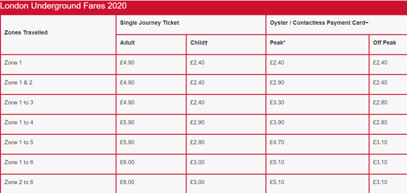 Лондон подразделяется на шесть транспортных зон, поэтому стоимость проезда устанавливается исходя из конечной точки маршрута. Например, станции первой зоны располагаются в центре города и ограничиваются Кольцевой линией. Соответственно, шестая зона со своими станциями находится на окраинах. Существуют и загородные зоны 7, 8, 9, до которых ходят поезда по линии Метрополитан.