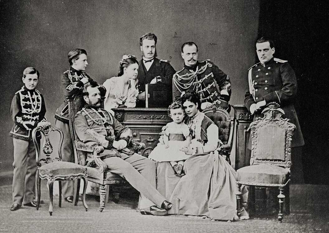 Стоят слева направо Великие князья и княгини Павел (1860−1919), Сергей (1857−1905), Мария (1853−1920), Алексей (1850−1908), Царевич Александр (будущий Император Александр III), Владимир (1847−1909). Справа от Императора сидит его невестка Мария Фёдоровна (1847−1928) со своим сыном Великим князем Николаем Александровичем (1868−1918), будущим Императором Николаем II