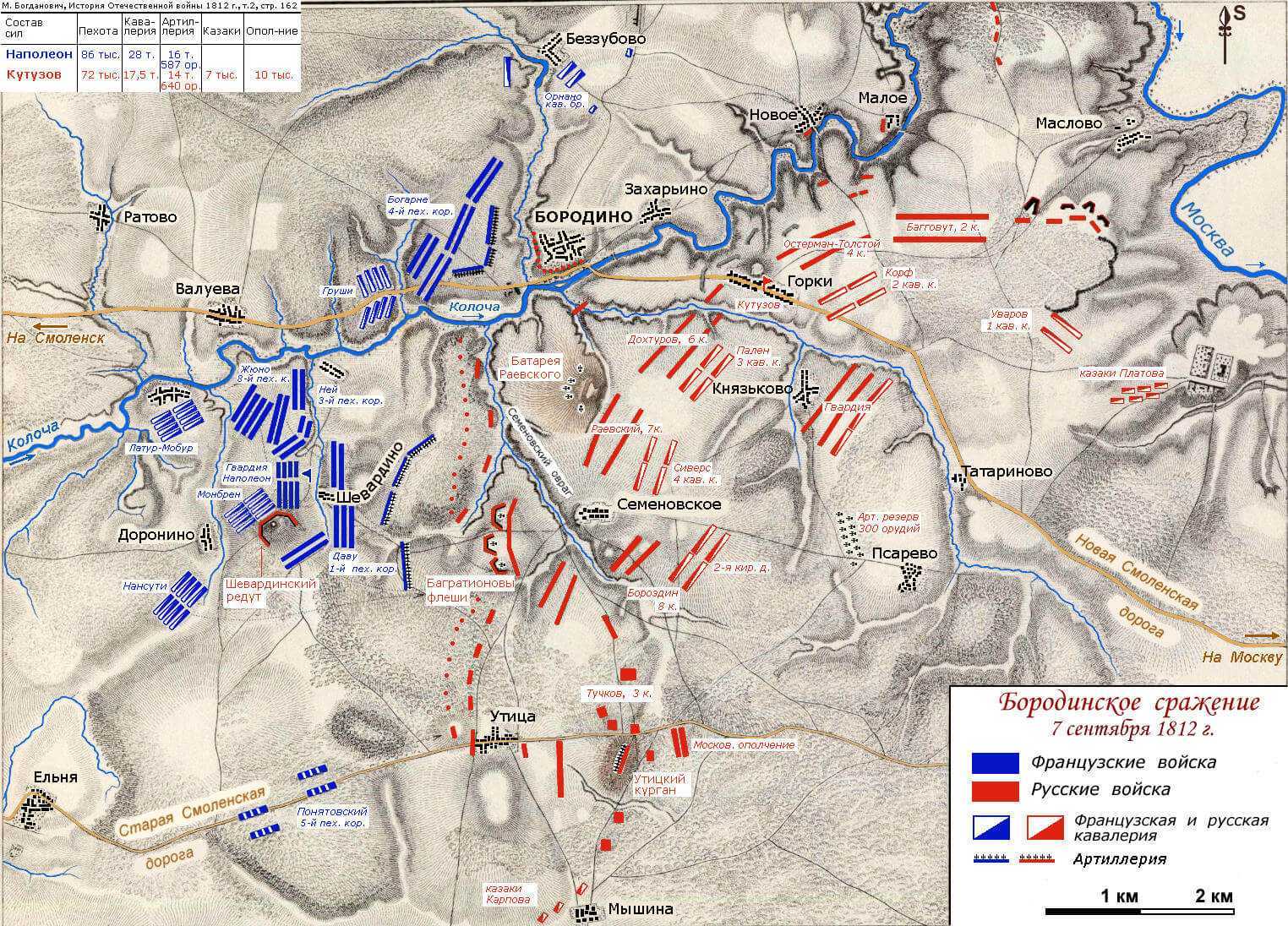 За 2 дня до Бородинского сражения произошел тяжелый Шевардинский бой, неподалеку от деревни Шевардино. Изначально там находилось чуть более 11 000 русских солдат и 36 орудий. При этом численность французов была втрое больше, а количество орудий достигало почти 200 единиц.