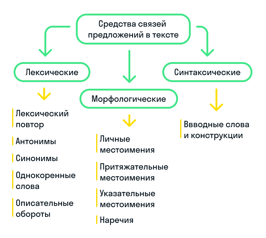 Как мы уже упомянули в начале, в русском языке средства связи соединяют предложения в тексте общей мыслью. Они позволяют идеям плавно переходить от одной к другой и дополнять друг друга. Всего выделяют три вида таких средств: лексические, морфологические и синтаксические.