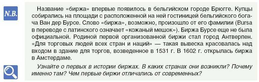 В XV в. в Европе появились и первые биржи, которые к XVII в. были представлены практически в каждом торговом европейском городе. Слово «биржа» обозначало специальное здание для совершения финансовых и торговых сделок. Предприниматели выставляли образцы своих товаров, подписывали контракты, получали денежные кредиты, приобретали ценные бумаги, которые нередко выполняли функцию денег.