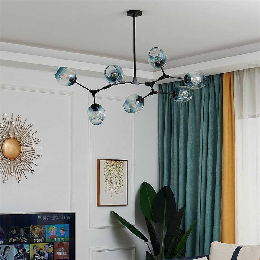 Приборы по типу молекулы отличаются не только разнообразием форм и исполнений, но и широким выбором их размеров. Важным критерием в выборе светильника, является размер комнаты и высота потолка. Так, при выборе основного осветительного прибора, необходимо подобрать такую высоту люстры, чтобы при вытянутой руке, вы ее не касались. Исключением является обеденный стол, либо другая поверхность, где исключается фактор касания ее человеком. Объемные люстры будут идеальным решением в просторных помещениях.