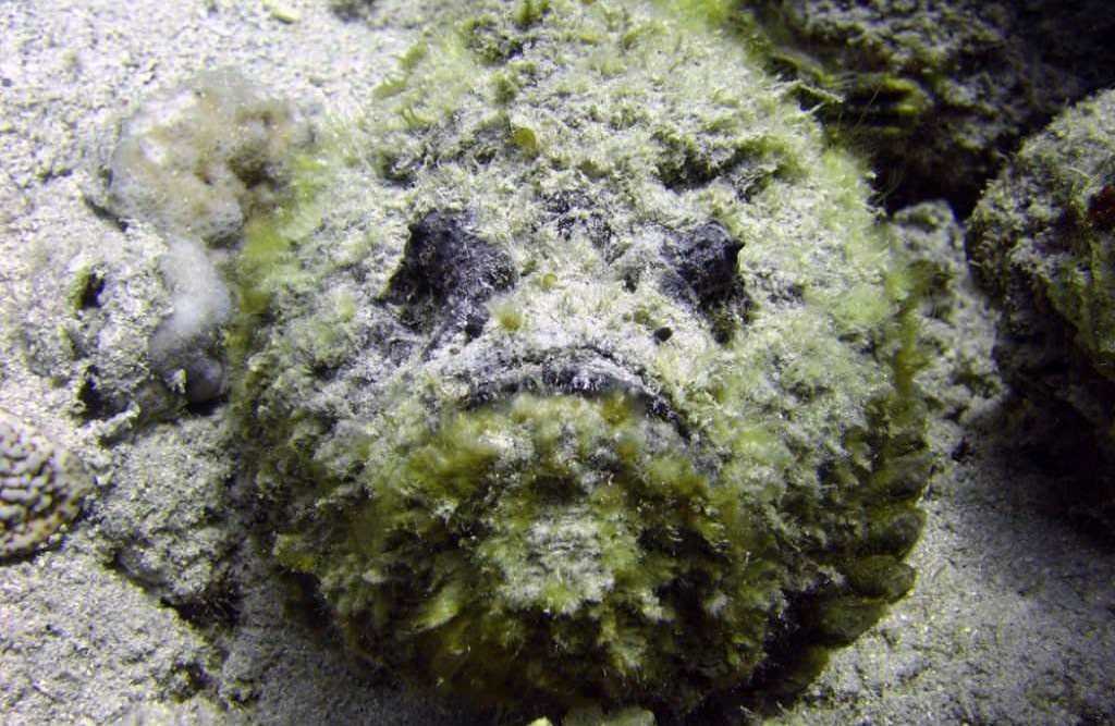 рыбу-камень, или бородавчатку — маскируется под каменное дно, опасны ее ядовитые шипы на спинном плавнике,