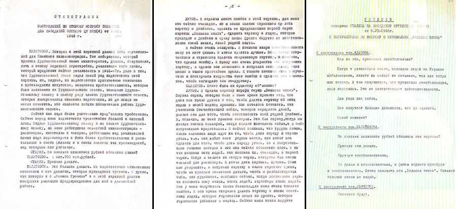 В фондах РГАСПИ, где хранятся доклады о встречах Сталина с представителями разных стран, журналистами, дипломатами, встречаются документы, где по окончании расшифровки речей всех участников присутствуют дополнительные страницы — реплики товарища Сталина. И некоторые из них весьма меткие, как, например, в стенограмме заседания оргбюро ЦК ВКП(б) 9 августа 1946 года, посвящённого обсуждению фильма «Большая жизнь». Судя по дате, речь идёт о второй серии фильма, которую зрители смогли увидеть только в 1958 году. Видимо, по результатам именно этого обсуждения картина и не попала на экраны. Начинает дискуссию начальник главного управления по производству художественных фильмов Комитета по делам кинематографии при Совнаркоме СССР Михаил Калатозов, заявляя, что «история этой картины должна быть поучительной для Комитета кинематографии». Беседу очень практично и по-хозяйски, без какой бы то ни было идейной подоплёки, подхватывает Сталин: