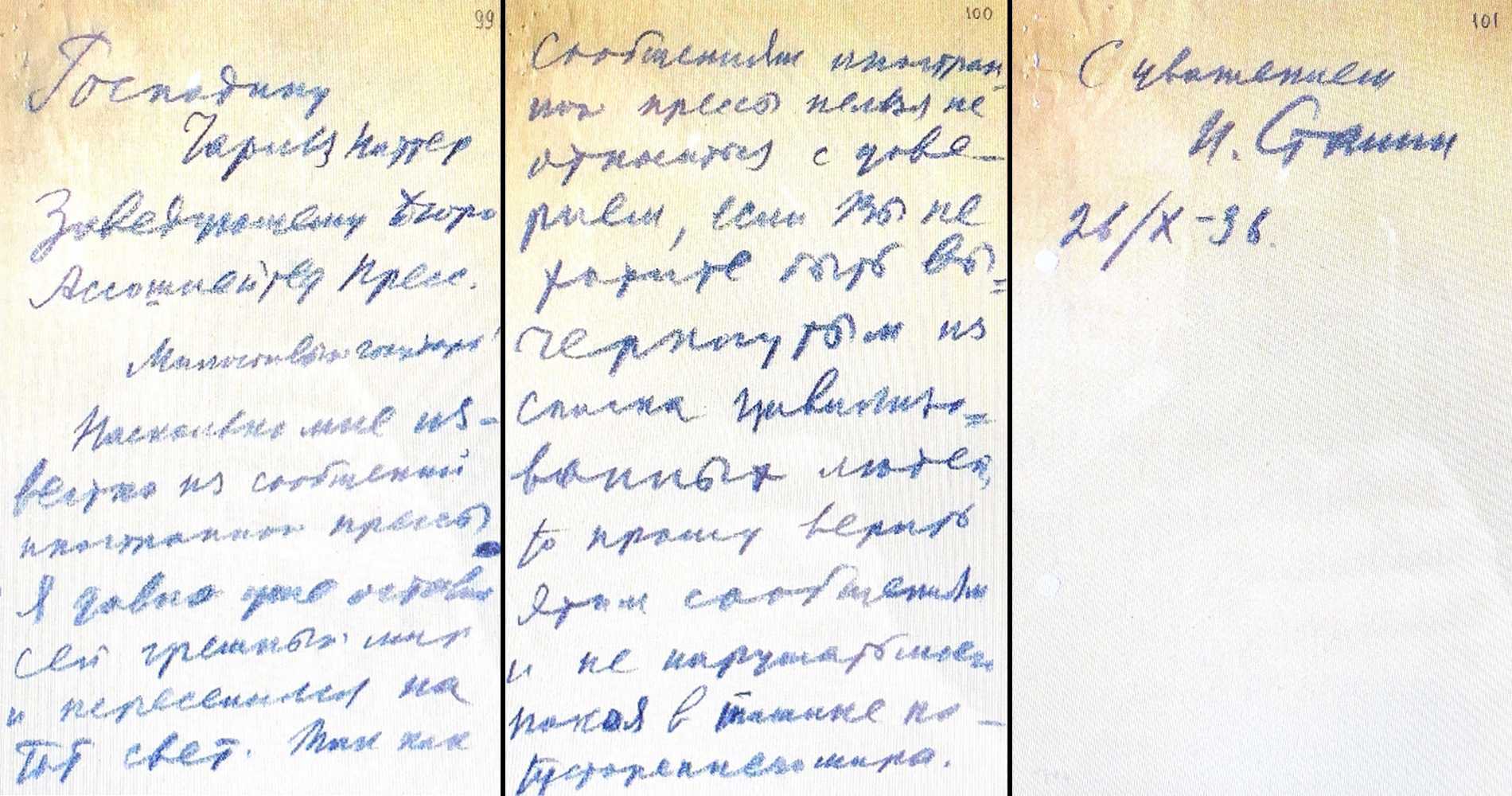 - Подлинник ответа Иосифа Сталина заведующему московского бюро Associated Press Чарльзу Наттеру, 26 октября 1936 года. Из личного архива Иосифа Сталина в Российском государственном архиве социально-политической истории. Фонд 558, опись 11, дело 1160, документ 40, листы 99—101