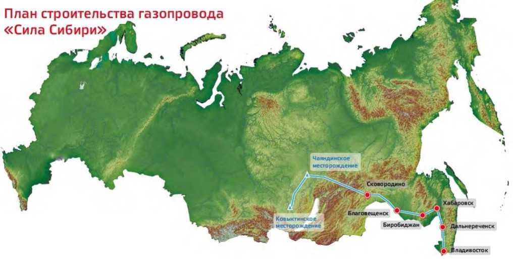 Первая очередь «Силы Сибири» от Чаяндинского месторождения в Якутии до города Благовещенска на Амуре будет построена к 2018 г., ее протяженность составит более 2200 км. Оттуда начнутся поставки газа в Китай. Затем якутское Чаяндинское месторождение будет соединено с расположенным в Иркутской области Ковыктинским месторождением второй очередью трубопровода, длина которой составит более 700 км. Запасы газа Чаяндинского месторождения оцениваются в 1,2 трлн т, запасы газа Ковыктинского месторождения – 1,5 трлн т. На Чаяндинском месторождении планируется добыча до 25 млрд кубометров газа и не менее 1,5 млн т нефти в год. Обустройство Чаянды начнется в 2015 г., добыча газа должна начаться в конце 2018 г., а первые экспортные поставки в Китай запланированы на 2019 г.